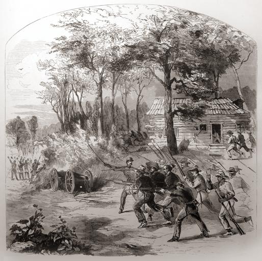 Keywords: monochrome drawing snow When the enemy were driven from their breastworks on the summit they attempted to run off one of their cannon. Captain Sayles and Lieutenant Atkinson, with about forty men of Company Q of the Thirteenth Indiana, started in pursuit. The Indianians, on turning the road, found the enemy drawn up across in front, firing from a log cabin and from bushes on the side of the way. They fired, stormed the house, and charged bayonets down the road, driving the enemy from their position, taking several prisoners and capturing the cannon without losing a man. (from Frank Leslie's Illustrated History of the Civil War..., edited by Louis Shepheard Moat, Published by Mrs. Frank Leslie, New York, 1895) When the enemy were driven from their breastworks on the summit they attempted to run off one of their cannon. Captain Sayles and Lieutenant Atkinson, with about forty men of Company Q of the Thirteenth Indiana, started in pursuit. The Indianians, on turning the road, found the enemy drawn up across in front, firing from a log cabin and from bushes on the side of the way. They fired, stormed the house, and charged bayonets down the road, driving the enemy from their position, taking several prisoners and capturing the cannon without losing a man. (from Frank Leslie's Illustrated History of the Civil War..., edited by Louis Shepheard Moat, Published by Mrs. Frank Leslie, New York, 1895) |