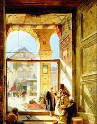 Keywords: Bauernfeind gate-mosque.jpg en Gate of the Great Mosque Damascus repro from art book Gustav Bauernfeind 1848-1904 oil on panel 106 x 91 cm PD-old Gustav Bauernfeind Inside the Umayyad Mosque Mosques in art