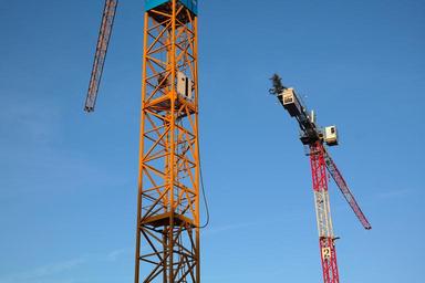 Keywords: baukran crane build site sky construction work lattice boom crane crane boom boom red yellow