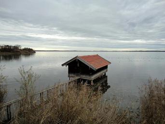 Keywords: bavaria chiemsee abendstimmung boat house jetty sky lake water clouds