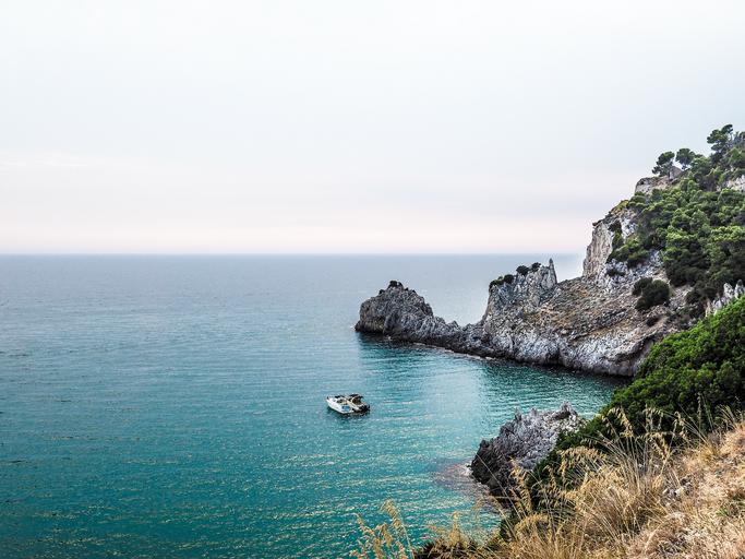Keywords: bay cove coast shore virw boat sea ocean water view craggy rocks scenic vacation holiday coastline seaside cliff
