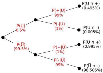 | Keywords: Bayes theorem drugs example tree.svg en Tree diagram for Bayes' theorem drug testing example U is the event that an individual is a user U bar is the event that an individual is not a user + is the event that an individual tests positive - is the event that an individual test negative 2011-08-18 own Gnathan87 cc-zero Check categories 2011 August 19 en wikipedia Bayes'_theorem 5 Uploaded with UploadWizard Bayes' theorem Tree diagrams | ||||