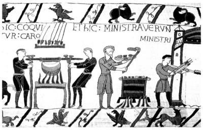 | Keywords: Bayeux-feast02.jpg Cooking meat for a feast Detail from the Bayeux Tapestry Scanned from Maggie Black's Den medeltida kokboken Swedish translation of The Medieval Cookbook ISBN 91-7712-380-8 PD-old-100 Meals in art Food in art Bayeux Tapestry BW plates Artworks missing infobox template |