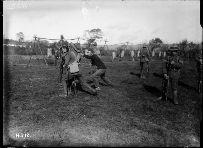 Keywords: blackandwhite monochrome outdoor black and white Members of the 3rd Battalion New Zealand Rifle Brigade receive instruction in 'fighting the blot stick' at a training ground in Henneveux, France. Photograph taken 31 October 1917 by Henry Armytage Sanders. Inscriptions: Inscribed - Photographer's title on negative -bottom left: H312. Quantity: 1 b&w original negative(s). Physical Description: Dry plate glass negative 4.75 x 6.5 inches Bayonet training of New Zealand troops in World War I. Royal New Zealand Returned and Services' Association :New Zealand official negatives, World War 1914-1918. Ref: 1/2-012953-G. Alexander Turnbull Library, Wellington, New Zealand. natlib.govt.nz/records/22716321 Members of the 3rd Battalion New Zealand Rifle Brigade receive instruction in 'fighting the blot stick' at a training ground in Henneveux, France. Photograph taken 31 October 1917 by Henry Armytage Sanders. Inscriptions: Inscribed - Photographer's title on negative -bottom left: H312. Quantity: 1 b&w original negative(s). Physical Description: Dry plate glass negative 4.75 x 6.5 inches Bayonet training of New Zealand troops in World War I. Royal New Zealand Returned and Services' Association :New Zealand official negatives, World War 1914-1918. Ref: 1/2-012953-G. Alexander Turnbull Library, Wellington, New Zealand. natlib.govt.nz/records/22716321 |