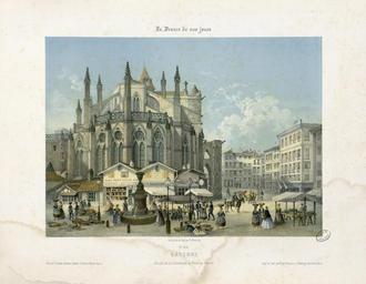| Keywords: Bayonne - Abside de la Cathédrale et Place du Marché - Fonds Ancely - B315556101 A MERCEREAU 7 088.jpg Impression en 3 coul par Frick frères à Paris Fait partie d'un ensemble de recueils de lithographies de Mercereau composés de lithographies provenant de La France de nos jours vaste suite publiée par livraisons de 1853 à 1876 et comprenant 475 planches en deux tirages l'un à deux teintes noir et bistre l'autre en couleurs Les libraires ont réuni ces planches en albums de composition variable quant au nombre de planches et aux dessinateurs Asselineau Mercereau Maurice Deroy etc Un titre Les Pyrénées par Ch Mercereau; Bagnères-de-Luchon par Ch Mercereau était frappé sur le plat supérieur de la reliure de l'album ainsi que le nom du Libraire pour lequel il était réalisé La plupart des recueils de ces planches pyrénéennes portent le nom de Sajous libraire à Bagnères-de-Luchon Pl 1 à 18 numérotées de 370 à 386 Pl 374 pl 5 et 6 en double -- Pl 19 20 et 21 numérotées respectivement 407 415 et 418 Ces trois pl ont été dessinées et lithographiées par Asselineau -- Pl 22 23 et 24 numérotées 438 439 et 440 -- Pl 22 lith par Aubrun -- Pl 25 numérotée 441 -- Pl 26 à 40 numérotées de 327 à 341 -- Pl 41 à 46 numérotées de 363 à 368 -- Pl 47 numérotée 369 -- Pl 48 num 292 -- Pl 49 et 50 num 264 et 265 -- Pl 51 et 52 num 268 et 269 -- Pl 53 à 55 num de 293 à 295 -- Pl 56 num 300 -- Pl 57 à 59 num de 307 à 309 -- Pl 60 à 70 num de 316 à 326 -- Pl 71 num 63 dessin et lith d'Asselineau imprimerie Destouches -- Pl 72 et 73 num 87 et 88 dessin et lith d'Asselineau imprimerie Destouches -- Pl 74 num 124 signée Lebreton éditée chez Lalonde à Paris et imprimée chez Becquet frères à Paris -- Pl 75 num 161 dessin et litho d'Asselineau imprimerie Destouches --Pl 76 à 78 num de 207 à 209 -- Pl 79 à 81 num de 211 à 213 -- Pl 82 num 220 dessin et lith de Maurice imprimerie Destouches -- Pl 83 à 86 num de 226 à 229 -- Pl 87 et 88 num 234 et 235 -- Pl 89 à 91 num de 273 à 275 -- Pl 92 et 93 num 290 et 291 Pièces jointes 6 pl sépia dont certaines sont des doubles du recueil de Mercereau Les cinq premières planches sont numérotées respectivement 318 321 324 331 386 La dernière planche n'est pas extraite de La France de nos jours mais de L'Espagne pittoresque et monumentale Ces six planches sont signées Mercereau éditées chez Sinnet et imprimées chez Frick frères Ancely René 1876 - 1966 Possesseur fre public domain domaine public B315556101_A_MERCEREAU_7_088 jpg image/jpeg 1 f de pl lithogr ; 29 cm oblong Sinnet F Éditeur Frick frères Imprimeur http //numerique bibliotheque toulouse fr/collect/general/index/assoc//ark /74899/B315556101_A_MERCEREAU_7_088 dir/B315556101_A_MERCEREAU_7_088 jpg Bibliothèque municipale de Toulouse A-MERCEREAU 7-88 Creator Charles Mercereau http //catalogues toulouse fr/web2/tramp2 exe/do_keyword_search/log_in setting_key BMT1 servers 1home query p001712 St Jean-de-Luz intérieur de l'Eglise St Jean-de-Luz le Château de l'Infante Biarritz Vue générale prise du Phare Château de Mauvesin près Bagnères-de-Bigorre Hautes Pyrénées Bagnères de Bigorre Hautes Pyrénées - Intérieur de l'Eglise des Carmes en couleurs Bagnères de Bigorre Hautes Pyrénées - Intérieur de l'Eglise des Carmes Bagnères-de-Bigorre - Eglise et couvent des Carmes Bagnères-de-Bigorre Hautes-Pyrénées - Tour des Jacobins Cascade et Pont de Magenta Vallée de l'Esponne Hautes Pyrénées Cascade de Trémes-Aïgues Vallée de Grip Hautes Pyrénées St Sauveur Hautes Pyrénées - Le Pont Napoléon Bayonne - Eglise St André Arreau et la Vallée d'Aure Hautes Pyrénées - Vue prise au dessus de la route du Col d'Aspin Auch - Vue prise sur les bords du Gers Auch - Vue de la Cathédrale Auch - Intérieur de la Cathédrale Bagnères-de-Bigorre - Vue Générale prise de la Fontaine ferrugineuse Eaux-Bonnes Basses-Pyrénées - L'établissement Thermal et la Chapelle Nantes - Vue de l'Eglise Ste Croix Le Croisic - Plage des Baigneurs et Etablissement de Bains Le Folgoët - Vue de l'Eglise Brèche de Roland prise de Gèdres Hautes Pyrénées Eglise des Templiers à Luz Chapelle du couvent de Pouëlahun i e Pouey Lahun - Vallée d'Azun Hautes Pyrénées Le Pont de Scia - Route de Luz à Gavarnie Hautes-Pyrénées Vue de l'établissement de la Raillière près Cauterets Hautes-Pyrénées Vue générale de Cauterets prise du Mamelon Vert Hautes-Pyrénées Vue du Fort de Lourdes Hautes-Pyrénées Vue d'Argelès-de-Bigorre Hautes-Pyrénées Vue de St Sauveur Hautes-Pyrénées Le Pas de l'Echelle Route de Gavarnie Hautes-Pyrénées Fond de la Vallée d'Argelès prise de la terrasse de St Savin Hautes-Pyrénées Place Grammont à Pau Basses-Pyrénées Vue générale des Eaux-Bonnes Basses-Pyrénées Barèges et la Vallée du Bastan Hautes-Pyrénées Chute supérieure du Pont d'Espagne Hautes-Pyrénées La grotte miraculeuse à Lourdes Hautes-Pyrénées Eglise de Bétharram et Pont de Lestelle Basses Pyrénées Cascade du Cerizet Près Cauterets Hautes-Pyrénées Pic du Midi d'Ossau 2885m Basses Pyrénées - Vue prise du 3e plateau de Bious-Artigues Toulouse - Cloître du Musée et Clocher des Augustins Pau - Vue prise de la terrasse du Château Pau - Vue du Château prise du Parc Toulouse - Cloître du Musée Galerie du Moyen-Age Toulouse - La maison de pierre fragment de la façade Toulouse - Intérieur de St Sernin St Jean-de-Luz Fort du Socoa Toulouse - Vue du Capitole Bordeaux Vue de la Porte du Caillau i e Cailhau Bordeaux Porte de la grosse Cloche Bordeaux Vue des Quinconces Bordeaux - Vue de la Tour et de l'Eglise de St Michel Toulouse - Vue du Pont de pierre prise du Quai de Brienne Toulouse - Abside de l'Eglise de St Sernin de l'an 1097 Toulouse - Choeur de la Cathédrale St Etienne Rouen - Hôtel de Bourgtheroulde Biarritz - Vue des Bains Napoléon et du Casino Biarritz - Vue des Bains du Port Vieux Biarritz - Vue de l'Entrée de l