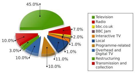 | Keywords: BBC broadcasting expenditure 2005-2006.svg en A pie chart showing the total broadcasting spend 2005-2006 of the BBC This was created in copy to a PNG-version of User Redvers based on http //www bbcgovernors co uk/annreport/report06/bbcannualreport pdf this PDF Using the free software library http //ez no/doc/components/view/latest/ file /introduction_Graph html ezcGraph PHP and edited with inkscape Arne Nordmann norro 2007 other fields I v + other versions translation possible SVG charts in English 3D pie charts Statistics of the BBC |