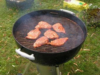 Keywords: BBQ - 001.jpg Fleisch auf einem BBQ-Grill von Weber Grills Meat on a barbecue grill by Weber Grills own 2004-07-18 http //www martinsteiger ch Martin Steiger self Martin Steiger Bild-CC-0 Outdoor barbecues Barbecued food Weber grills