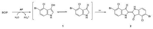 | Keywords: BCIP reaction.svg enzymatische Hydrolyse von BCIP Hydrolysis of 5-Bromo-4-chloro-3-indolyl phosphate BCIP by alkaline phosphatase Own 12 05 08 Yikrazuul Biochemistry methods Indoles Organobromides Organochlorides Organophosphates Enzyme reactions EC 3 1 3 |