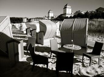Keywords: beach chairs eastern germany canopy relaxing vacation summer holidays sand leisure black and white