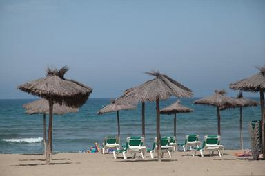 Keywords: beach holiday parasols sand sea water nature sun travel spain tourism rest sun loungers