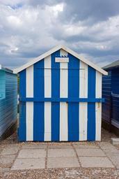 Keywords: beach house beach hut hut wooden stripes blue white single one image photo holiday