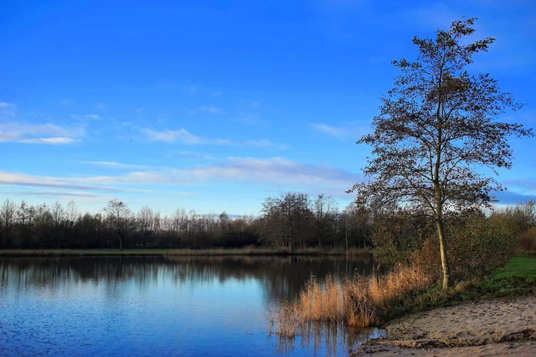 Keywords: beach lake stretch morning blue sky mood ruhr bald trees late autumn badesee water bank autumn