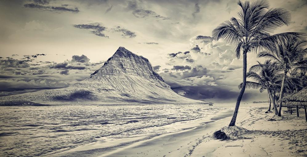 Keywords: beach mountain mountain beach palma palm trees bw b w water sea bathing summer recreation paradise palm beach footprints footprints in the sand holiday