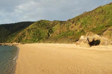 Keywords: Beach north of Uarau Point in evening sunlight.jpg Beach north of Uarau Point in evening sunlight Own 2015-04-06 Pseudopanax wikipedia en 40 47 53 8 S 172 57 7 3 E Abel Tasman National Park Beaches of New Zealand