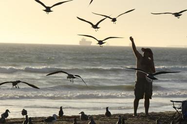 Keywords: beach outdoor seagulls feeding flock flying ocean sea