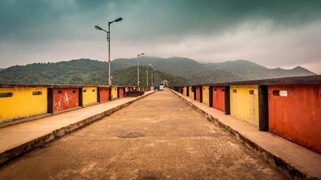 Keywords: beach path road sea nature landscape travel tourism vacation sky holiday walk yellow destination red hill mountain side lamp post light