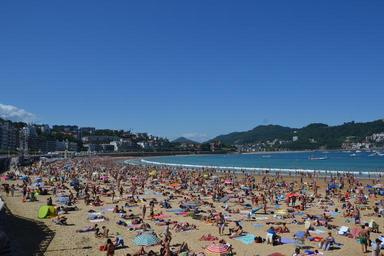 Keywords: beach people crowd parasol sea sand holiday sun tourism seaside sandy beach summer travel sun loungers blue side water ocean