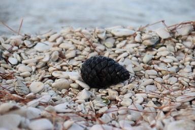 Keywords: beach rocks pebbles pine cone water sea ocean nature