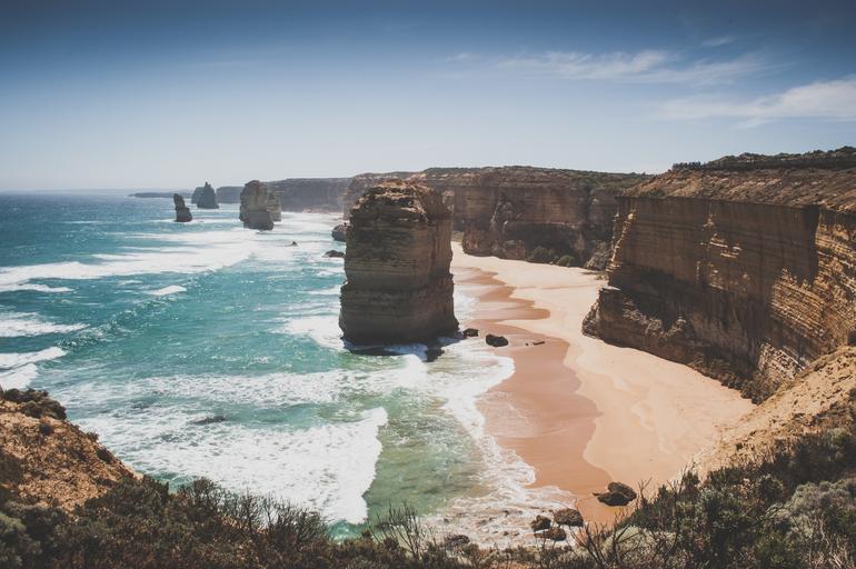 Keywords: beach sand shore coast ocean sea water waves sunshine sunny summer cliffs rocks boulders blue sky