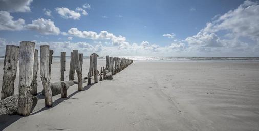 Keywords: beach sand wood posts blue sky clouds shore water sunshine