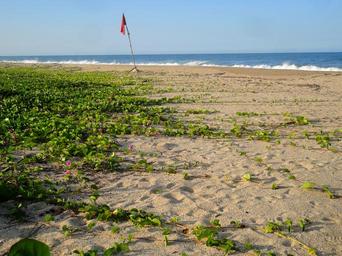 Keywords: beach sea rest unaffected nature wave spray plant green santa martha colombia south america parque tayrona nature conservation national park sand flag wind blue sky distant wide view overview