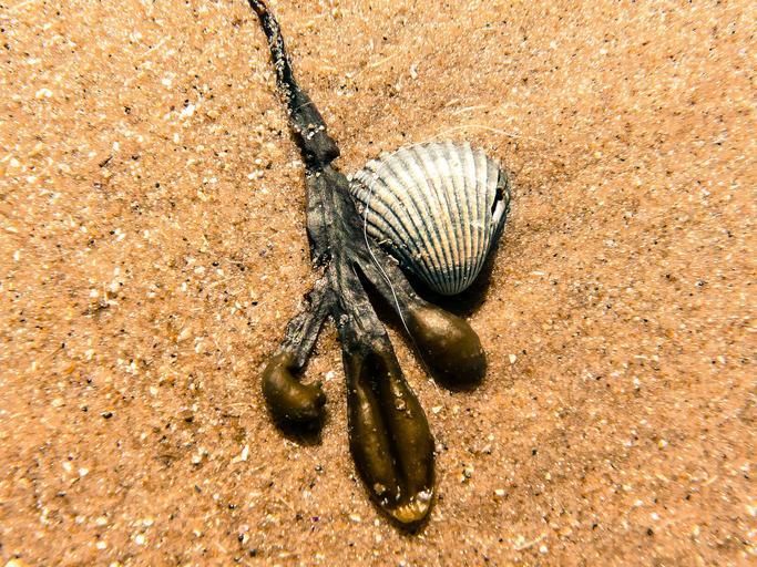 Keywords: beach shell seaweed seashell sand beach macro excerpt of the beach decorative close