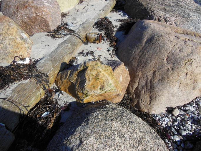 Keywords: beach stone granite flint brown flint wood pole close-up red gray red granite gray granite sand seaweed pebbles