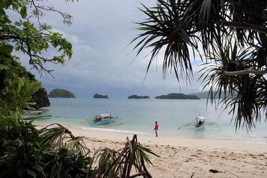 Keywords: beach summer place rock stone stone formation water breeze white sand sand mountain green mountain small waves clouds nature sky boat