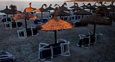 Keywords: beach sun loungers holiday sand beach tourism abendstimmung at night leisure sunset water ocean mediterranean mallorca sunbathing sand recover night mood sea evening coast recovery rest travel parasols shade tree empty