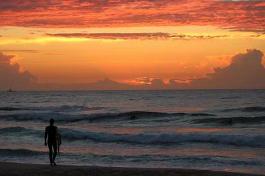Keywords: beach surfer silhouette sunrise sky sand coast waves outdoor landscape morning walking clouds watching seascape
