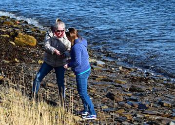Keywords: beachcomber girl woman mother daughter happy beach sand rocks shoreline female sea person young shore people coast beachcombing coastline walking shells