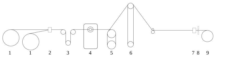 Keywords: Bead wire line.svg en Bead wire line for making bead wire of tyres<br> 1 - let-off drum 2 - device for producing bead wire tape strand 3 - heater 4 - crosshead extruder 5 - pull-off drum 6 - festoon 7 - paying-on head 8 - cutter die 9 - winding unit hu Huzalkarikagyártó gép<br> 1 leeresztődob 2 pászmásító 3 huzalmelegítő 4 keresztfejes extruder 5 lehúzó 6 kompenzátor 7 léptetőfej 8 vágóbélyeg 9 huzalkarikatekercselő dob own kifo 2011-07-19 Cc-zero Manufacturing processes Tires |