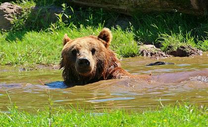 Keywords: bear brown bear water puddle to bathe refresh yourself relaxed dormant lazing around head enjoy cozy lying animal nature