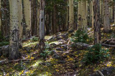 | Keywords: abineau-bear jaw loop abineaubearjawloop arizona bear jaw trail bearjawtrail bear jaw trail #26 bearjawtrail26 bear jaw trail no. 26 bearjawtrailno26 coconino national forest coconinonationalforest flagstaff ranger district flagstaffrangerdistrict forest service forestservice san francisco mountain sanfranciscomountain san francisco peaks sanfranciscopeaks u.s. forest service usforestservice usfs fall fall color fallcolor fall colors fallcolors fall foliage fallfoliage flagstaff forest hiking outdoors trail outdoor landscape plant tree Fall color September 25, 2016 in the upper end of Bear Jaw Canyon, Bear Jaw Trail. Trees are approximately half turned, with some groups peaking or approaching peak color. Lower elevations of the trail are mostly green. Expect peak season through the first weekend of October on the upper end of the trail, and through the first week of October for the lower end of the trail. Abineau Trail is a steep 1,800 foot climb over two miles up the slopes of the San Francisco Peaks through Abineau Canyon. The trail meets the Waterline Trail at the top, which can be followed down to Bear Jaw Trail to return to the trailhead. Each leg of the loop is approximately two miles long, plus a 0.4 mile connector trail from the trailhead to the loop, making a total loop hike of approximately seven miles. The loop is one of the quintessential autumn hikes in the San Francisco Peaks. Aspens along all three legs of the loop turn gold, and falling leaves carpet the forest floor and decorate the conifers. Photo by Deborah Lee Soltesz, September 25, 2015. Credit: U.S. Forest Service, Coconino National Forest. For more information about this trail, see the Abineau-Bear Jaw Loop trail description on the Coconino National Forest website. Fall color September 25, 2016 in the upper end of Bear Jaw Canyon, Bear Jaw Trail. Trees are approximately half turned, with some groups peaking or approaching peak color. Lower elevations of the trail are mostly green. Expect peak season through the first weekend of October on the upper end of the trail, and through the first week of October for the lower end of the trail. Abineau Trail is a steep 1,800 foot climb over two miles up the slopes of the San Francisco Peaks through Abineau Canyon. The trail meets the Waterline Trail at the top, which can be followed down to Bear Jaw Trail to return to the trailhead. Each leg of the loop is approximately two miles long, plus a 0.4 mile connector trail from the trailhead to the loop, making a total loop hike of approximately seven miles. The loop is one of the quintessential autumn hikes in the San Francisco Peaks. Aspens along all three legs of the loop turn gold, and falling leaves carpet the forest floor and decorate the conifers. Photo by Deborah Lee Soltesz, September 25, 2015. Credit: U.S. Forest Service, Coconino National Forest. For more information about this trail, see the Abineau-Bear Jaw Loop trail description on the Coconino National Forest website. |