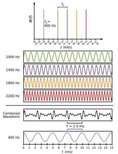 | Keywords: Beat frequency (1000, 1400, 1800, 2200).svg en A diagram showing four sinusoids of frequencies 1200 1400 1600 and 1800 hertz green purple orange and red Also shown is the summed signal black and the sinusoid with the same period as the beat frequency f<sub>0</sub> 200 Hz Above is the spectrum of the signals own Inductiveload 2009-02-15 Beat frequency 1000 1400 1800 2200 zh svg Beat frequencies Audiology Sensory Neuroscience Hearing and speech | ||||