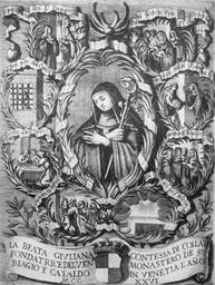 | Keywords: Beata Giuliana di Collalto litography.png Giuliana nacque a Collalto nel 1186 dal Conte Rambaldo VI e da Giovanna dei Conti di Sant ™Angelo di Mantova Educata alla preghiera a soli 12 anni vestì l ™abito di San Benedetto nel Monastero di Santa Margherita in quel di Salarola sui Colli Euganei e a 34 anni conobbe Beatrice d ™Este con la quale fondò una nuova comunitĂ religiosa Giuliana di Collalto si spostò nell ™isola chiamata allora Spinalonga ora Giudecca dove riedificò ingrandì e portò all ™antico splendore la chiesa abbattuta di San Cataldo La chiesa divenne luogo di preghiera e penitenza dedicato ai Santi Biagio a Cataldo Eletta badessa nel nuovo monastero Giuliana compì molti miracoli prima e dopo la morte avvenuta il primo giorno di settembre del 1262 a 76 anni Prima di morire Beata Giuliana patì di forti mal di testa e per questo è ancor oggi invocata dai sofferenti di emicrania Sepolta nel cimitero della Chiesa dei Santi Biagio e Cataldo Beata Giuliana di Collalto come attestano numerosi biografi continuò a dispensare miracoli anche dopo la sua morte Intorno al 1290 il corpo della Beata venne ritrovato integro così come la cassa in legno Il corpo venne dapprima collocato in una sarcofago ligneo ora conservato al Museo Correr di Venezia e successivamente nel 1733 posto in un altare in marmo della chiesa dedicata ai Santi Biagio e Cataldo Nei primi anni del Cinquecento la nomea di Giuliana come taumaturga delle emicranie cominciò a diffondersi e raggiunse una considerevole notorietĂ Nel 1753 Papa Benedetto XI estese ai feudi della famiglia Collalto il culto della Beata Giuliana fino ad allora limitato alla sola cittĂ di Venezia Portato nel 1810 nella chiesa del Redentore il corpo di Beata Giuliana fu spostato nel 1822 nella parrocchiale di Santa Eufemia dove tuttora è venerato all ™interno della cappella dedicata a Sant ™Anna it Incisione in rame della Beata Giuliana contessa di Collalto Anonimo cm 19 8 x 4 9 Scan from the book Collalto Antonio Menegon of a copper incision Antonio Menegon PD-Art Lithographs Medieval Christian saints Christian nuns Coats of arms of the House of Collalto House of Collalto Artworks missing infobox template |