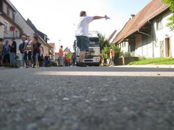 Keywords: Beatparade2010 4.JPG en A man wearing a white T-shirt of interesting design performing a dance act with a cloth which he threw also in the air between 2 music trucks own Empfingerbua 2010-08-21 Beatparade 2010