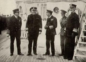 | Keywords: Beatty Rodman KingGeorgeV KingEdwardVIII Sims.jpg David Beatty RN Rear Admiral Hugh Rodman USN King George V Prince Edward later King Edward VIII Vice Admiral William S Sims USN http //www firstworldwar com/photos/sea3 htm specifically http //www firstworldwar com/photos/graphics/hw_germfleetsurr_02 jpg here ; this image a crop of Underwood Underwood's original was first published in cite book March Francis Andrew Beamish Richard Joseph 1919 History of the World War John C Winston Company Philadelphia United States p 674 http //books google com/books id AGFJAAAAMAAJ pg PA674 2009-08-17 Underwood Underwood<ref> cite book Thomas John Gilbert Bigwood Inez 1919 Winning a Cause World War Stories Silver Burdett Company United States p 189 http //books google com/books id yv0WAAAAYAAJ pg PA189 2009-08-17 </ref> 1918-07-22 PD-Underwood References reflist David Beatty George V of the United Kingdom Edward VIII of the United Kingdom Underwood Underwood Hugh Rodman William Sims |