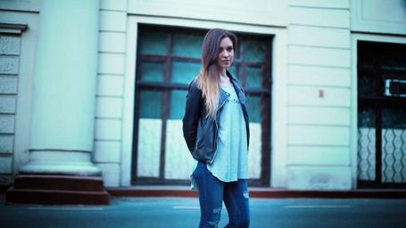 Keywords: beautiful girl street style girl in leather jacket city evening blue youth eyes view model