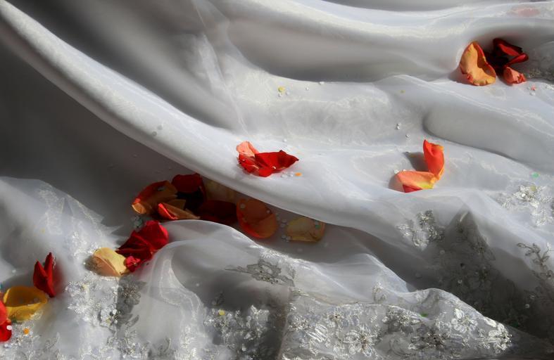 Keywords: beautiful wedding dress wedding dress train luxurious soft white lace folds light rose petals romantic sentimental