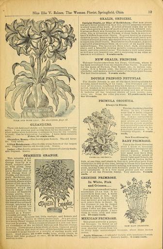 | Keywords: Beautify your homes (15727475764).jpg page iS <br> OLEANDERS <br> These old-fashioned shrubs are becoming immensely popular <br> again I am growing and selling them by the thousands No <br> plant makes more handsome specimens in tubs for the veranda <br> or yard Can be wintered in the cellar I have three colors to <br> offer Price 10 cents eacli <br> Oleander Rosea ” lias double pink flowers The old favor- <br> ite Very sweet <br> Lilian Henderson ” Has double white flowers of the largest <br> size Fragrant like the old double pink Scarce <br> Lutea ”Has double primrose yellow flowers of a lovely shade; <br> also fragrant Scarce <br> OTAHEITE ORANGE <br> This valuable and <br> distinct variety of the <br> Orange family is a <br> dwarf compact grow- <br> er with glossy deep <br> green foliage which <br> has a decided odor of <br> the Orange trees of <br> Florida and is exceed- <br> ingly floriferous pro- <br> ducing a wonderful <br> profusion of pure white <br> flowers of the most de- <br> licious fragrance <br> Identical with the <br> much sought - for <br> blooms of Southern <br> Orange groves Ota- <br> heite fruits immediate- <br> ly afterflowering bear- <br> ing fruitaboutone-half <br> thesize of the ordinary <br> Orange retaining in a <br> marked degree its <br> sweetness This unique <br> Orange cannot be <br> equaled as a Winter- <br> blooming pot plant for – <br> house culture Requires but little sunlight and flowers and <br> fruits when but twelve to fifteen inches high As a pot plant <br> this lovely Dwarf Orange is one of the most novel and beautiiul <br> that can be grown With a couple of plants of it you can have <br> an abundance of the far-famed delicate and fragrant Orange <br> blossoms I have grown a large stock of clean vigorous plants <br> that will bloom and fruit at once of this beautiful orange and <br> commend it to mv friends as a novelty of sterling worth and <br> merit Good plants 10 cents each; large strong plants to <br> bloom and bear profusely at once a5 to ° cents each ac- <br> cording to size <br> OXALIS ORTGIESI <br> Upright Oxalis or Star of Bethlehem ” Few new plants <br> will give better satisfaction than this as it is a perpetual bloomer <br> in every sense of the word It is full of bloom every day in the <br> year when grown in a pot of good soil and with ordinary care <br> It grows as freely as a Geranium in any situation Itisa shrubby <br> plant like a Geranium or Fuchsia without buds in which re- <br> spect it differs from other Oxalis It grows twelve to eighteen <br> inches in height branching freely and loaded at all times with <br> clusters of bright golden star-shaped flowers which do not close <br> at night like other Oxalis Beautiful as the flowers are it is still <br> a splendid plant without them on account of its highly orna- <br> mental foliage The leaves are three lobed dark olive green <br> above and a beautiful shining metallic crimson purpleunder- <br> neath and wine-colored stems This makes a truly novel plant <br> as well as a very beautiul one and is surprising to see what at- <br> tention it will attract 8 cents each <br> NEW OXALIS PRINCESS <br> This new Oxalis comes from San Diego California where it <br> has been introduced from the islands of the Pacific It goes un- <br> der the name of Duchess Pink Beauty etc in various cata- <br> logues It is a bright pink the flowers the size of a quarter <br> of a dollar and makes a perfect carpet of its brightpink flowers <br> The best Oxalis extant 6 cents each <br> DOUBLE FRINGED PETUNIAS <br> The double Petunia is one of the finest bedding plants for <br> massing mixed borders or for vases The brilliancy and va- <br> riety of its colors combined with the duration of its blooming <br> period renders it invaluable for garden decoration My col- <br> lection is unsurpassed for brilliancy ot color and size of bloom <br> It includes all the brightest shades of pink purple rose <br> white etc Name the color you want 15 cents each; two <br> for £5 cents <br> PRIMULA OBCONICA <br> Always in Bloom <br> This is a charming plantfor <br> Winter In fact 1 know of <br> none that is better adapted <br> to home culture than this <br> one It is not susceptible to <br> changes of temperature that <br> most plants are subject to <br> It bears its elegant panicles <br> and sprays of bloom of adel- <br> icate pink and white in the <br> greatest profusion It is <br> certainly elegant 8 cents <br> each <br> New Everblooming <br> BABY PRIMROSE <br> This is the freest blooming <br> plant I know of blooming <br> continuously throughout the <br> entire season Plants in <br> very small pots have from <br> fifteen to twenty sprays of <br> lovely light pink flowers on <br> stems ten to twelve inches <br> high at one time and plants in four-inch pots often have from <br> twenty-five to fifty at one time lasting in bloom fully four weeks <br> without fading and continually sending new sprays all over the <br> plant making it one of the most desirable plants for the house <br> ever introduced It 'is a very rapid grower and the easiest <br> grown of all the Primrose family Very desirable 8 cents <br> each <br> CHINESE PRIMROSE <br> In White Pink <br> and Crimson <br> Few house plants afford better <br> satisfaction than this It re- <br> quires to be kept cool a north <br> window suiting it best Care <br> should be taken in watering it <br> that no water gets on the buds <br> as it causes them to decay In <br> the Summer it can be turned <br> out into a shady border The <br> plants I offer are fine and the <br> colors are sure to please I have <br> them in white pink and crim- <br> son iO cents each <br> MEXICAN PRIMROSE <br> This plant is strictly a perpet- <br> ual bloomer In flower at all <br> seasons of the year agood speci- <br> men showing always from ten <br> to thirty large saucer-shaped blossoms about three inches <br> across <br> Apple Blossom ” A splendid variety with handsome flowers 