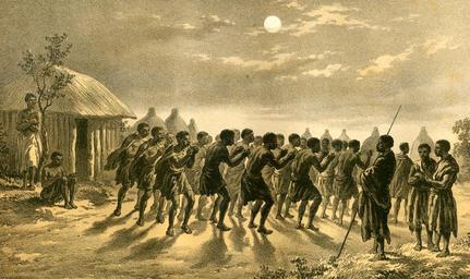 | Keywords: Bechuana Reed Dance.jpg en Bechuana Reed Dance by Moonlight Livingstone describes a dance The people usually show their joy and work off their excitement in dances and songs The dance consists of the men standing nearly naked in a circle with clubs or small battle-axes in their hands and each roaring at the loudest pitch of his voice while they simultaneously lift one leg stamp heavily twice with it then lift the other and give one stamp with that; this is the only movement in common The arms and head are thrown about also in every direction; and all this roaring is kept up with the utmost possible vigour; the continued stamping makes a cloud of dust ascend and they leave a deep ring in the ground where they have stood If the scene were witnessed in a lunatic asylum it would be nothing out of the way and quite appropriate even as a means of letting off the excessive excitement of the brain p 225 1857 http //libweb5 princeton edu/visual_materials/maps/websites/africa/livingstone/livingstone-images html David Livingstone Missionary Travels and Researches in South Africa Including a Sketch of Sixteen Years ™ Residence in the Interior of Africa and a Journey from the Cape of Good Hope to Loanda on the West Coast Thence Across the Continent Down the River Zambesi to the Eastern Ocean London John Murray 1857 David Livingstone other versions PD-Art Uploaded with UploadWizard Dance of Africa Tswana people Culture of Botswana Dance in art |