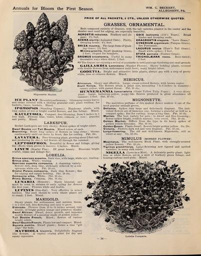 | Keywords: Beckert's garden field and flower seeds (Page 36) (16561289725).jpg Annuals for Bloom the First Season <br> WM C BECKERT <br> ALLEGHENY PA <br> PRICE OF ALL PACKETS 5 CTS UNLESS OTHERWISE QUOTED <br> GRASSES ORNAMENTAL <br> Beds composed entirely of Grasses with the tall varieties planted in the center and the <br> shorter ones used for edging are especially beautiful <br> Feathery and ele- <br> Pretty <br> ACROSTIS nebulosa <br> gant; 1 feet <br> AVENA sterilis Animated Oats <br> drooping heads; i feet <br> BRIZA maxima The large form of Quak- <br> ing Grass; VA feet <br> Minima gracilis Small Quaking Grass; <br> 1 foot ; elegant for bouquets <br> BROMUS brizaeformis Useful in many <br> decorative ways when dried ; 2 feet <br> Mignonette Machet <br> ICE PLANT Mesembryanthemum <br> and stems covered with a shining granular coat; plant trailing <br> baskets vases borders Mixed <br> IPOMOPSIS Standing Cypress Handsome plants with <br> long spikes of red or bright scarlet flowers and fine foliage Mixed <br> KAUXJFUSSIA Compact free-blooming from 6 inches to 1 <br> foot high Flowers blue violet white crimson or rose ; graceful <br> and pretty Mixed <br> LARKSPUR <br> Rocket Larkspurs are very showy; flower-spikes of bright colors <br> Dwarf Double and Tall Double Mixed colors of each <br> Branching Bears long spikes of flowers on long stems blooms <br> continuously until cut down by frost; fine for cutting Pkt 10c <br> LAVATERA Free-blooming plant growing about 2 feet tall <br> and producing its sho\ y red flowers all through the summer <br> LEPTOSIPHON Beautiful in flower and foliage giving <br> fine effects when grown in masses ; 6 inches Mixed <br> LINTIM Scarlet Flax Of great beauty Blossoms bright <br> scarlet stems and foliage fine <br> LOBELIA <br> Erinus speciosa superba Dark blue with large white eye; trailing <br> Erin us alba White; trailing <br> Speciosa superba compacta A charming variety; <br> flowers rich deep blue strikingly relieved by a con- <br> spicuous white eye Pkt 10 cts <br> Crystal Palace compacta Dark blue flowers ; fine <br> for edging and carpet bedding Pkt 10 cts <br> Compacta alba White ¢ Pkt 10 cts <br> Prima Donna Crimson Pkt 10 cts <br> LVNARIA Honesty Hardy biennial and <br> must be sown in autumn or early spring for flowers <br> the first year Flowers white and double <br> LUPINUS Sun-dial Very effective in mixed <br> borders The seed should be sown where plants are <br> to stand; 2 feet Mixed <br> MARIGOLD <br> Showy plants for midsummer and autumn bloom <br> 1 to 2 feet tall free-flowering and easy to grow <br> Eldorado Flowers from 10 to 14 inches around very <br> double of bright golden orange and primrose shades <br> Dwarf African Dwarf dense growth and immense <br> double flowers of a peculiar shade of golden yellow <br> Tall Double French Mixed; flowers of various <br> bright colors <br> Dwarf Double French Plants low and compact Mixed <br> Signata pumila Dwarf plants; forms a true gilt <br> edge for beds <br> MATHIOLA bicornis Delightfully fragrant <br> lilac flowers A capital edging plant for dry and <br> sunny exposures <br> COIX lachryma Job's Tears Broad <br> blades and drooping seeds <br> ERACROSTIS elegans Love Grass <br> CYNERIUM argenteum Pampas Grass <br> See Perennials <br> LACURUS ovatus Hare's Tail Grass <br> Small white spikes; 2 feet <br> STIPA pennata Feather Grass <br> TRICHOL/EANA rosea Rose-tinted; <br> 2 feet <br> « ° The Grasses are enjoying a revival of popularity in bothLandscape Gardening and small grounds <br> GAIULAR DIA Lorenziana Blanket Flower Showy bedding plants covered <br> with double flowers from midsummer until frost; many bright colors <br> GODETIA Bright and attractive little plants always gay with a crop of pretty <br> white rose or crimson flowers Mixed <br> HIBISCUS <br> Africanus Showy and effective Large cream-colored flowers with brown center <br> Giant Yellow The flowers attain a great size measuring 7 to 8 inches in diameter; <br> canary-yellow with garnet throat Pkt 10 cts <br> HUNNEMANNIA fumariaefolia Giant Yellow Tulip Poppy A very showy <br> plant Large buttercup-yellow poppy-like flowers produced in great abundance all <br> summer; 2 feet Pkt 10 cts <br> listening waxen leaves MIGNONETTE <br> The matchless perfume of this modest flower renders it one of the <br> most popular annuals grown <br> Defiance Spikes very large and deliciously fragrant The indi- <br> vidual flowers are of immense size forming a graceful as well as a <br> compact spike; fine for cutting; keeps a long time Pkt 10 cts <br> Machet The best variety for pots ; is dwarf and free-blooming ; <br> flower-spikes bright reddish maroon; very sweet Pkt 10 cts <br> Golden Machet Differs from the type in its heavy spikes of <br> golden yellow blossoms Pkt 10 cts <br> Colden Queen Plants dwarf; flowers bright golden yellow Oz 20c <br> Victoria Flowers dark red and very fragrant Pkt 10 cts <br> Large-flowering The old and well-known Mignonette still as <br> sweet as any Oz 15 cts <br> MIMULUS MONKEY FLOWER <br> Moschatus The well-known Musk Plant with strongly-scented <br> yellow flowers Pkt 10 cts <br> Tigrinus grandiflorus Large-flowering new tigered and spotted <br> varieties in many rich colors <br> NIGELEA Love-in-a-Mist A delicately pretty plant; light <br> blue or white flowers set in a mist of feathery green foliage and <br> bearing curious seed-pods Mixed <br> Lobelia Compacta 43294142 138660 69754 Page 36 Text http //www biodiversitylibrary org/page/43294142 1901 10 5962/bhl title 69754 Henry G Gilbert Nursery and Seed Trade Catalog Collection ; Wm C Beckert Firm NameFound Africanus NameFound Bromus NameConfirmed Bromus EOLID 108079 NameBankID 2660780 NameFound Coix NameConfirmed Coix EOLID 108123 NameBankID 2661572 NameFound Compacta alba NameFound Erinus speciosa superba NameFound Godetia NameConfirmed Godetia EOLID 5466836 NameBankID 3471363 NameFound Hibiscus NameConfirmed Hibiscus L EOLID 60741 NameFound Hunneman