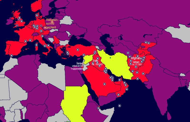 | Keywords: Bedrohungirans.png Verbündete der USA rot ; US-Militärbasen; Schurkenstaaten gelb ; neutrale oder beim Konflikt mit dem Iran ambivalente Länder violett ; grau nicht direkt oder nur wenig involvierte Staaten sei es wegen zu geringer Bedeutung auf der internationalen Bühne sei es wegen selbst auferlegter Zurückhaltung Wichtige Hinweise Die Karte ist sachlich teilweise ungenau bei der Aufteilung in violett bzw grau und Die Lage kann sich gfs sehr rasch ändern Am Besten wäre wohl eine Neubearbeitung mit detaillierterer Differenzierung Rolle Libyens Das war selbst einmal ein Schurkenstaat ; Rolle Usbekistans laviert wie andere zentralasiatische Staaten im Großen Spiel zwischen Russland den USA und China ; Rolle Pakistans hat die Rolle als US-Lakai satt ; Bulgarien oder auch die Ukraine wollen in die NATO je nachdem wer gerade regiert usw own 2007 Korosaspa Military maps of Iran International relations maps of Iran |