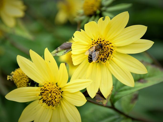 Keywords: bee blossom bloom close flower insect sprinkle yellow plant nature