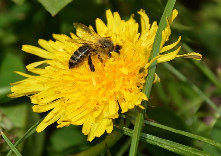 Keywords: bee dandelion yellow spring green wings brown