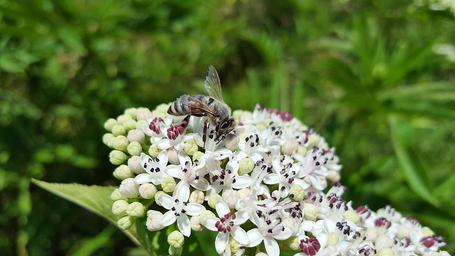 Keywords: bee honey bee anthophila insect pollen collect sambucus ebulus danewort dwarf elder flower spring antennas