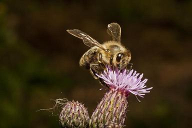 Keywords: bee honey honey bee flower nectar collect insect blossom bloom purple pink thistle wild flower close wing probe search pollen flower honey