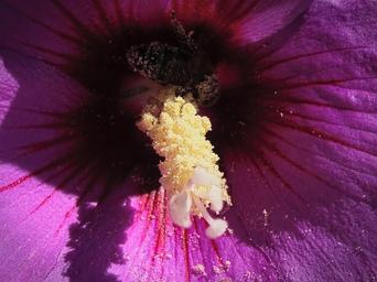 | Keywords: Free Photo of a Bee in a purple Hibiscus flower, under Creative Commons CC0