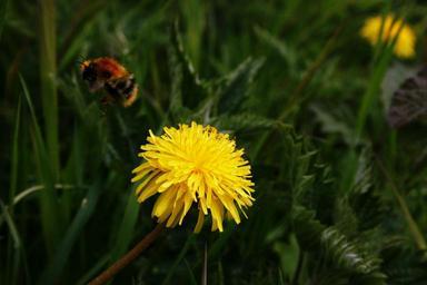 Keywords: bee insect dandelion blossom bloom yellow background spring grass stinging nettle fly